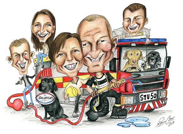 These caricatures make great family portraits and don't forget to include the all important pets! Although, rest assured, the pooches on the left are not really left to drive the fire engine!